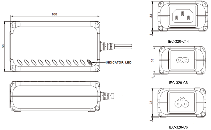 | Notes: | 1. “X” in model number indicates AC inlet. “X” can either be “A” for IEC-320-C14, “B” for IEC-320-C8, or “C” for IEC-320-C6. 2. Avg. efficiency at 25, 50, 75, and 100% of max. rated output current. 3. Standard Output Cable: 12~21V: UL2468, 16AWG, 1M 21~24V: UL2468, 18AWG, 1M 4. Optional output connectors available. 5. This product is Listed to applicable standards and requirements by UL. *Due to advances in technology, specifications subject to change without notice. |