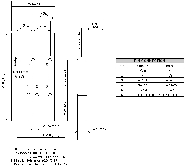 | Notes: | 1. Input reflected ripple measured with simulated source impedance of 12 uH. 2. The DM series requires a minimum 10% load on the output to maintain specified regulation. Operation under no-load condition will not damage these devices, however they may not meet all listed specifications. 3. Efficiency is typical values at nominal input voltage and full load. 4. BELLCORE TR-NWT-000332. Case I: 50% stress, temperature at 40°C. (Ground fixed and controlled environment). 5. Heat sink is optional, consult factory. 6. Pin 4 absent on single output models. 7. Remote On/Off control is optional. For positive logic add suffix (P), for negative logic add suffix (R). 8. All case and pin to case dimensions are for reference only unless otherwise noted. 9. PC pins - 0.04" dia. X 0.20" long (minimum) typical five places. 10. Pin to pin tolerance: ±0.01", pin diameter tolerance: ±0.005". 11. Significant capcitive load on output may inhibit start-up and operation, consult factory. 12. All DC/DC converters should be externally fused on the front end for protection. Due to advances in technology, specifications are subject to change without notice. |